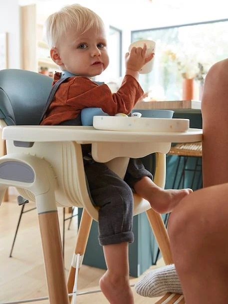 - Chaise haute évolutive : réglable sur 2 hauteurs. Position haute, hauteur d’assise = 62 cm, position basse, hauteur d’assise = 34 cm